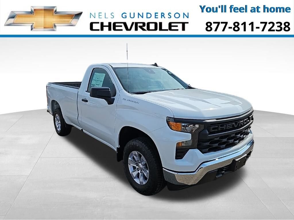 Summit White 2025 Chevrolet Silverado 1500 WT Commercial 4WD 10-Speed Automatic EcoTec3 5.3L V8 10-Speed Automatic, 4WD, Black Cloth.Nels Gunderson Chevrolet is honored to offer this dependable 2025 Chevrolet Silverado 1500 WT in Summit White, beautifully equipped with Preferred Equipment Group 1WT (3.5 Monochromatic Display Driver Info Center, 4-Way Manual Driver Seat Adjuster, Black (Semi-Gloss) Front Bumper, Black (Semi-Gloss) Rear Bumper, Bluetooth® For Phone, Electronic Cruise Control, Front Frame-Mounted Black Recovery Hooks, HD Rear Vision Camera, Heated Power-Adjustable Outside Mirrors, Inside Rear-View Mirror w/Tilt, Locking Tailgate, Manual Tailgate Function w/No EZ Lift, Manual Tilt Wheel Steering Column, OnStar Services Capable, Power Front Windows w/Driver Express Up/Down, Power Front Windows w/Passenger Express Down, Remote Keyless Entry, Rubberized-Vinyl Floor Covering, SiriusXM Delete, Solar Absorbing Tinted Glass, Standard Tailgate, Teen Driver, Tire Pressure Monitoring System, and Wi-Fi Hot Spot Capable), Standard Suspension Package, Trailering Package (Hitch Guidance), Work Truck Package (Heavy-Duty Air Filter), WT Convenience Package (Deep-Tinted Glass and Electric Rear-Window Defogger), WT Value Package, 10-Speed Automatic, 4WD, Black Cloth, 120-Volt Bed Mounted Power Outlet, 120-Volt Interior Power Outlet, 170 Amp Alternator, 2 Speakers, 2-Speaker Audio System, 220 Amp Alternator, 4-Wheel Disc Brakes, 40/20/40 Front Split Bench Seat, ABS brakes, Air Conditioning, Apple CarPlay/Android Auto, Auto High-beam Headlights, Auto-Locking Rear Differential, Automatic Emergency Braking, Auxiliary External Transmission Oil Cooler, Brake assist, Compass, Delay-off headlights, Driver door bin, Dual front impact airbags, Dual front side impact airbags, Electronic Stability Control, Emergency communication system: OnStar, External Engine Oil Cooler, EZ Lift Power Lock & Release Tailgate, Following Distance Indicator, Forward Collision Alert, Front anti-roll bar, Front Center Armrest w/Storage, Front Chrome Bumper, Front License Plate Kit, Front Pedestrian Braking, Front reading lights, Front wheel independent suspension, Fully automatic headlights, Heated door mirrors, Illuminated entry, Integrated Trailer Brake Controller, IntelliBeam Automatic High Beam On/Off, Lane Keep Assist w/Lane Departure Warning, LED Cargo Area Lighting, Low tire pressure warning, Occupant sensing airbag, Outside temperature display, Overhead airbag, Overhead console, Panic alarm, Passenger door bin, Passenger vanity mirror, Power door mirrors, Power steering, Power windows, Premium audio system: Chevrolet Infotainment 3, Radio data system, Radio: Chevrolet Infotainment 3 System, Rear Chrome Bumper, Rear reading lights, Rear step bumper, Remote keyless entry, Speed control, Speed-sensing steering, Tachometer, Tilt steering wheel, Traction control, Trip computer, Variably intermittent wipers, Vinyl Seat Trim, Voltmeter, Wheels: 17 x 8 Bright Silver Painted Aluminum, and Wheels: 17 x 8 Ultra Silver Painted Steel Backup Camera Bluetooth. Price includes: $1000 - Bonus Cash. Exp. 09/30/2025 $2250 - Customer Cash. Exp. 09/30/2025