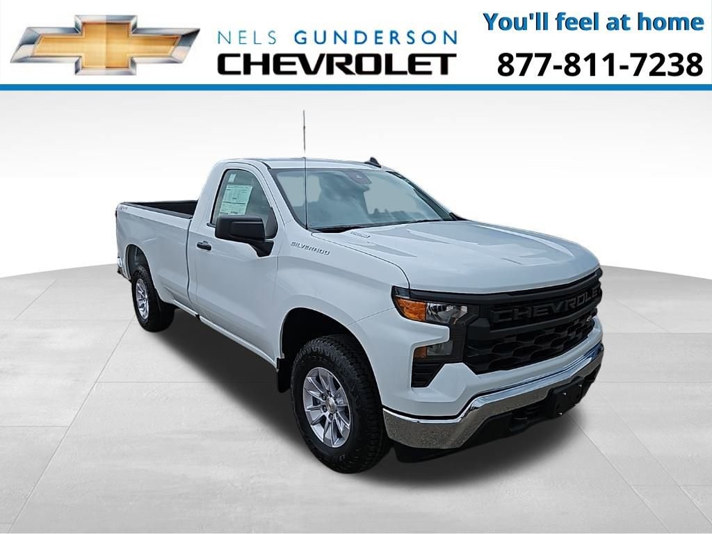 Summit White 2025 Chevrolet Silverado 1500 WT Commercial 4WD 8-Speed Automatic 2.7L I4 Turbocharged DOHC 16V LEV3-SULEV30 310hp 8-Speed Automatic, 4WD, Black Cloth.Nels Gunderson Chevrolet is excited to offer this hard-working 2025 Chevrolet Silverado 1500 WT in Summit White, beautifully equipped with Preferred Equipment Group 1WT (3.5 Monochromatic Display Driver Info Center, 4-Way Manual Driver Seat Adjuster, Black (Semi-Gloss) Front Bumper, Black (Semi-Gloss) Rear Bumper, Bluetooth® For Phone, Electronic Cruise Control, Front Frame-Mounted Black Recovery Hooks, HD Rear Vision Camera, Heated Power-Adjustable Outside Mirrors, Inside Rear-View Mirror w/Tilt, Locking Tailgate, Manual Tailgate Function w/No EZ Lift, Manual Tilt Wheel Steering Column, OnStar Services Capable, Power Front Windows w/Driver Express Up/Down, Power Front Windows w/Passenger Express Down, Remote Keyless Entry, Rubberized-Vinyl Floor Covering, SiriusXM Delete, Solar Absorbing Tinted Glass, Standard Tailgate, Teen Driver, Tire Pressure Monitoring System, and Wi-Fi Hot Spot Capable), Standard Suspension Package, Trailering Package (Hitch Guidance), Work Truck Package (Heavy-Duty Air Filter), WT Convenience Package (Deep-Tinted Glass and Electric Rear-Window Defogger), WT Value Package, 8-Speed Automatic, 4WD, Black Cloth, 120-Volt Bed Mounted Power Outlet, 120-Volt Interior Power Outlet, 2 Speakers, 2-Speaker Audio System, 220 Amp Alternator, 3.42 Rear Axle Ratio, 4-Wheel Disc Brakes, 40/20/40 Front Split Bench Seat, ABS brakes, Air Conditioning, Apple CarPlay/Android Auto, Auto High-beam Headlights, Auto-Locking Rear Differential, Automatic Emergency Braking, Brake assist, Compass, Delay-off headlights, Driver door bin, Dual front impact airbags, Dual front side impact airbags, Electronic Stability Control, Emergency communication system: OnStar, EZ Lift Power Lock & Release Tailgate, Following Distance Indicator, Forward Collision Alert, Front anti-roll bar, Front Center Armrest w/Storage, Front Chrome Bumper, Front License Plate Kit, Front Pedestrian Braking, Front reading lights, Front wheel independent suspension, Fully automatic headlights, Heated door mirrors, Illuminated entry, Integrated Trailer Brake Controller, IntelliBeam Automatic High Beam On/Off, Lane Keep Assist w/Lane Departure Warning, LED Cargo Area Lighting, Low tire pressure warning, Occupant sensing airbag, Outside temperature display, Overhead airbag, Overhead console, Panic alarm, Passenger door bin, Passenger vanity mirror, Power door mirrors, Power steering, Power windows, Premium audio system: Chevrolet Infotainment 3, Radio data system, Radio: Chevrolet Infotainment 3 System, Rear Chrome Bumper, Rear reading lights, Rear step bumper, Remote keyless entry, Speed control, Speed-sensing steering, Tachometer, Tilt steering wheel, Traction control, Trip computer, Variably intermittent wipers, Vinyl Seat Trim, Voltmeter, Wheels: 17 x 8 Bright Silver Painted Aluminum, and Wheels: 17 x 8 Ultra Silver Painted Steel Backup Camera Bluetooth. Price includes: $1000 - Bonus Cash. Exp. 12/01/2025 $3000 - Customer Cash. Exp. 12/01/2025