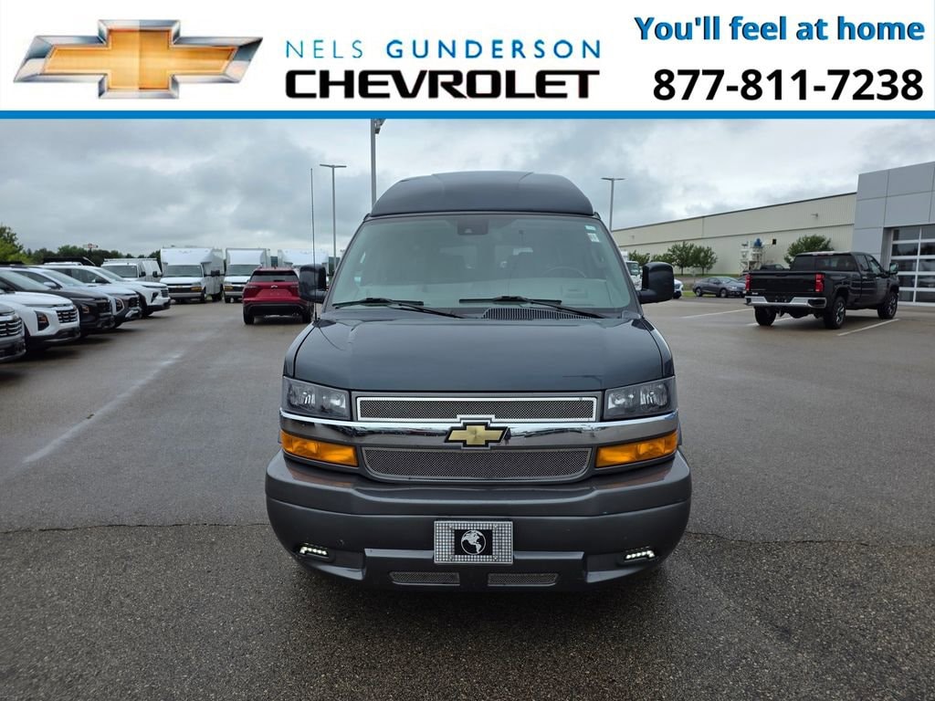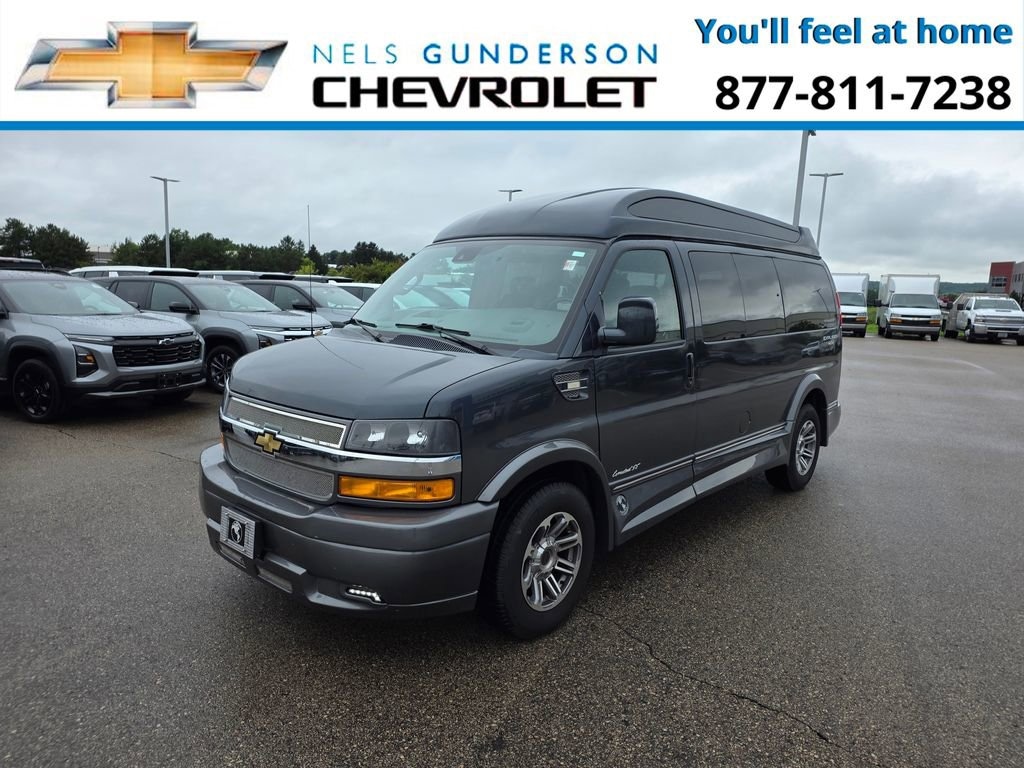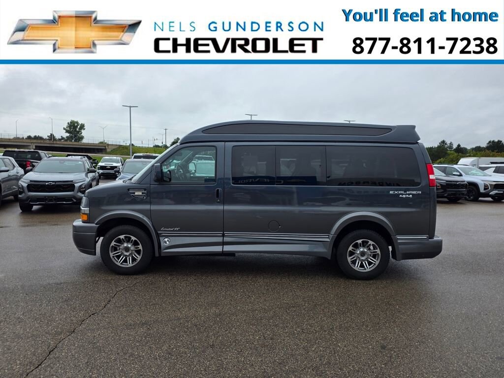 Nels Gunderson Chevrolet is delighted to offer this fantastic 2019 Chevrolet Express 2500 Explorer Conversion in Shadow Gray. This Coversion was done by the Explorer Van Company to include a 4 wheel drive conversion, Touring Suspension w/ Eaton soft ride suspension, Power retractable boards, Sport roof to accomodate the 29' HDTV w/ blu ray, full leather seating, wireless charging pads, backup camera in the navigation system, swivel captain chairs, heated front seats, power sunroof. This is a full interior and exterior conversion that you don't want to miss out on!!! Beautifully equipped with ABS brakes, Electronic Stability Control, Emergency communication system, Low tire pressure warning, Traction control, 16 x 6.5 Steel Wheels, 2 Speakers, 3.42 Rear Axle Ratio, 4-Wheel Disc Brakes, Air Conditioning, AM/FM radio, AM/FM Stereo w/MP3 Player, Delay-off headlights, Driver & Front Passenger High-Back Bucket Seats, Driver door bin, Driver's Seat Mounted Armrest, Dual front impact airbags, Dual front side impact airbags, Exterior Parking Camera Rear, Front anti-roll bar, Front Bucket Seats, Front Reclining High-Back Bucket Seats, Front wheel independent suspension, Full-Length Black Rubberized-Vinyl Floor Covering, Fully automatic headlights, Occupant sensing airbag, Overhead airbag, Passenger cancellable airbag, Passenger door bin, Passenger seat mounted armrest, Power steering, Power windows, Seat-Mounted & Roof-Rail Side-Impact Airbags, Single-Zone Manual Air Conditioning, Tachometer, Trip computer, Variably intermittent wipers, Vinyl Seat Trim, and Voltmeter. ABS brakes, Electronic Stability Control, Emergency communication system, Low tire pressure warning, Traction control. Recent Arrival!