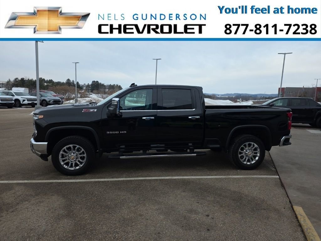 Nels Gunderson Chevrolet is proud to offer this hard-working 2024 Chevrolet Silverado 3500HD LTZ in Black, beautifully equipped with Gooseneck/5th Wheel Prep Package (Chevytec Spray-On Black Bedliner), Hitch Package (LPO), LTZ Convenience Package (2 Charge/Data USB Ports Inside Center Console, Bose Premium 7-Speaker Sound System, Floor-Mounted Center Console, Front Bucket Seats, Ventilated Driver & Front Passenger Seats, and Wireless Charging), LTZ Convenience Package II (Adaptive Cruise Control, Heated 2nd Row Outboard Seats, Power Sliding Rear Window w/Defogger, and Universal Home Remote), LTZ Premium Package (Wheels: 20 12-Spoke Polished), Preferred Equipment Group 1LZ (120-Volt Bed Mounted Power Outlet, 120-Volt Interior Power Outlet, 170 Amp Alternator, 6-Speaker Audio System Feature, Auto-Dimming Inside Rear-View Mirror, Bluetooth® For Phone, Chevrolet Connected Access Capable, Chrome Door Handles, Chrome Mirror Caps, Color-Keyed Carpeting Floor Covering, Compass Located In Instrument Cluster, Deep-Tinted Glass, Electric Rear-Window Defogger, EZ Lift Power Lock & Release Tailgate, Front LED Fog Lamps, Front Rain-Sensing Wipers, Front Rubberized Vinyl Floor Mats, HD Rear Vision Camera, Heated Steering Wheel, Hitch Guidance w/Hitch View, In-Vehicle Trailering App System, Keyless Open & Start, Manual Tilt-Wheel/Telescoping Steering Column, OnStar & Chevrolet Connected Services Capable, Power Door Locks, Power Front Windows w/Driver Express Up/Down, Power Front Windows w/Passenger Express Up/Down, Power Rear Windows w/Express Down, Push Button Start, Rear Rubberized-Vinyl Floor Mats, Remote Vehicle Starter System, SiriusXM w/360L, Standard Tailgate, Steering Wheel Audio Controls, Steering Wheel Mounted Electronic Cruise Control, Unauthorized Entry Theft-Deterrent System, Wi-Fi Hotspot Capable, and Wrapped Steering Wheel), Safety Package (Bed View Camera w/2 Trailer Camera Provisions, HD Surround Vision, Rear Cross Traffic Alert, Safety Alert Seat, Trailer Camera Provisions, Trailer Side Blind Zone Alert, and Ultrasonic Front & Rear Park Assist), Snow Plow Prep/Camper Package (220 Amp Alternator), Suspension Package, Technology Package (Auto-Dimming Inside Rearview Mirror w/Camera and Multicolor 15 Diagonal Head-Up Display), Up-Level Rear Seat w/Storage Package, Z71 Off-Road & Protection Package (All-Weather Floor Liners (LPO) (AAK)), Z71 Off-Road Package (Hill Descent Control), 10-Speed Automatic, 4WD, Jet Black Leather, 10-Way Power Driver Seat Adjuster w/Lumbar, 10-Way Power Passenger Seat Adjuster w/Lumbar, 4-Wheel Disc Brakes, 6 Speakers, 6 Rectangular Chromed Tubular Assist Steps, ABS brakes, Air Conditioning, Alloy wheels, AM/FM radio: SiriusXM with 360L, Apple CarPlay/Android Auto, Auto High-beam Headlights, Auto-dimming door mirrors, Auto-dimming Rear-View mirror, Automatic temperature control, Brake assist, Bumpers: chrome, Compass, Delay-off headlights, Driver door bin, Driver Memory, Driver vanity mirror, Dual front impact airbags, Dual front side impact airbags, Durabed Pickup Bed, Electronic Stability Control, Engine Block Heater, Exhaust Brake, Front 40/20/40 Split-Bench Seats w/Lockable Storage, Front anti-roll bar, Front Center Armrest w/Storage, Front dual zone A/C, Front fog lights, Front License Plate Kit, Front reading lights, Front wheel independent suspension, Fully automatic headlights, Heated door mirrors, Heated Driver & Front Outboard Passenger Seats, Heated front seats, Heated steering wheel, Heavy-Duty 80 Amp-Hr Battery, High Idle Switch, Illuminated entry, LED Cargo Area Lighting, LED Smoked Amber Roof Marker Lamps, LED Taillamps w/Fixed Signature, Low tire pressure warning, Memory seat, Multi-Flex Tailgate, Occupant sensing airbag, Outside temperature display, Overhead airbag, Overhead console, Panic alarm, Passenger door bin, Passenger vanity mirror, Perf Leather-Appointed Front Outboard Seat Trim, Power door mirrors, Power driver seat, Power passenger seat, Power steering, Power windows, P
