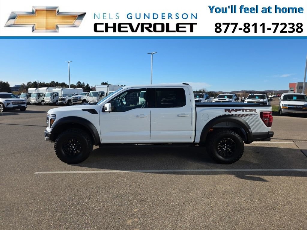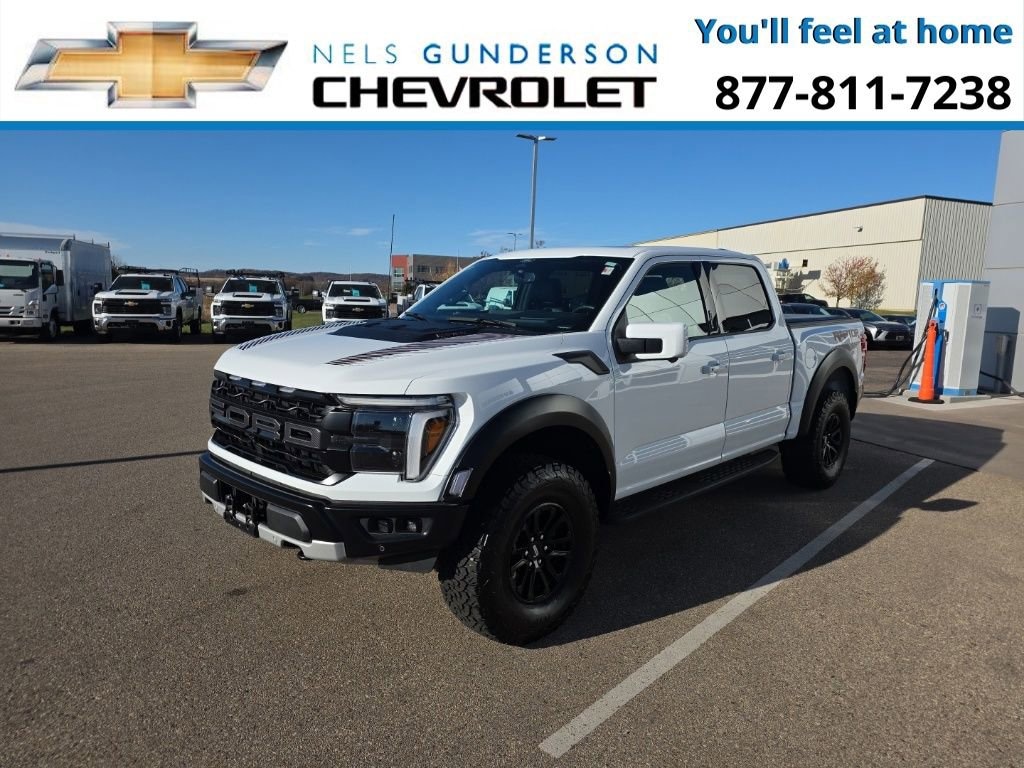 Nels Gunderson Chevrolet is pleased to offer this rock solid 2024 Ford F-150 Raptor in Oxford White, beautifully equipped with Equipment Group 801A Standard, 4WD, 14 Speakers, 17 Cast Aluminum Wheels, 4-Wheel Disc Brakes, ABS brakes, Adaptive suspension, Adjustable pedals, Air Conditioning, Alloy wheels, AM/FM radio: SiriusXM with 360L, Auto High-beam Headlights, Auto tilt-away steering wheel, Auto-dimming door mirrors, Auto-dimming Rear-View mirror, Automatic temperature control, Brake assist, Bumpers: body-color, Compass, Delay-off headlights, Driver door bin, Driver vanity mirror, Dual front impact airbags, Dual front side impact airbags, Electronic Locking w/4.10 Axle Ratio, Electronic Stability Control, Emergency communication system: SYNC 4 911 Assist, Engine Block Heater, Front anti-roll bar, Front Bucket Seats, Front Center Armrest, Front dual zone A/C, Front fog lights, Front License Plate Bracket, Front reading lights, Front wheel independent suspension, Fully automatic headlights, Garage door transmitter, Heads-Up Display, Heated door mirrors, Heated front seats, Heated rear seats, Heated steering wheel, Illuminated entry, Lane Departure Warning System, Leather Trim Seats, Low tire pressure warning, Memory seat, Navigation system: Connected Navigation, Occupant sensing airbag, Outside temperature display, Overhead airbag, Overhead console, Panic alarm, Passenger door bin, Passenger vanity mirror, Pedal memory, Power door mirrors, Power driver seat, Power passenger seat, Power steering, Power windows, Radio data system, Radio: B&O Unleashed Sound System by Bang & Olufsen, Rain sensing wipers, Rear reading lights, Rear step bumper, Rear window defroster, Remote keyless entry, Security system, Speed control, Speed-sensing steering, Split folding rear seat, Steering wheel memory, Steering wheel mounted audio controls, SYNC 4 w/Enhanced Voice Recognition, Tachometer, Telescoping steering wheel, Tilt steering wheel, Tough Bed Spray-In Bedliner, Traction control, Trip computer, Turn signal indicator mirrors, Twin Panel Moonroof, Variably intermittent wipers, and Ventilated front seats. 4WD. Recent Arrival!